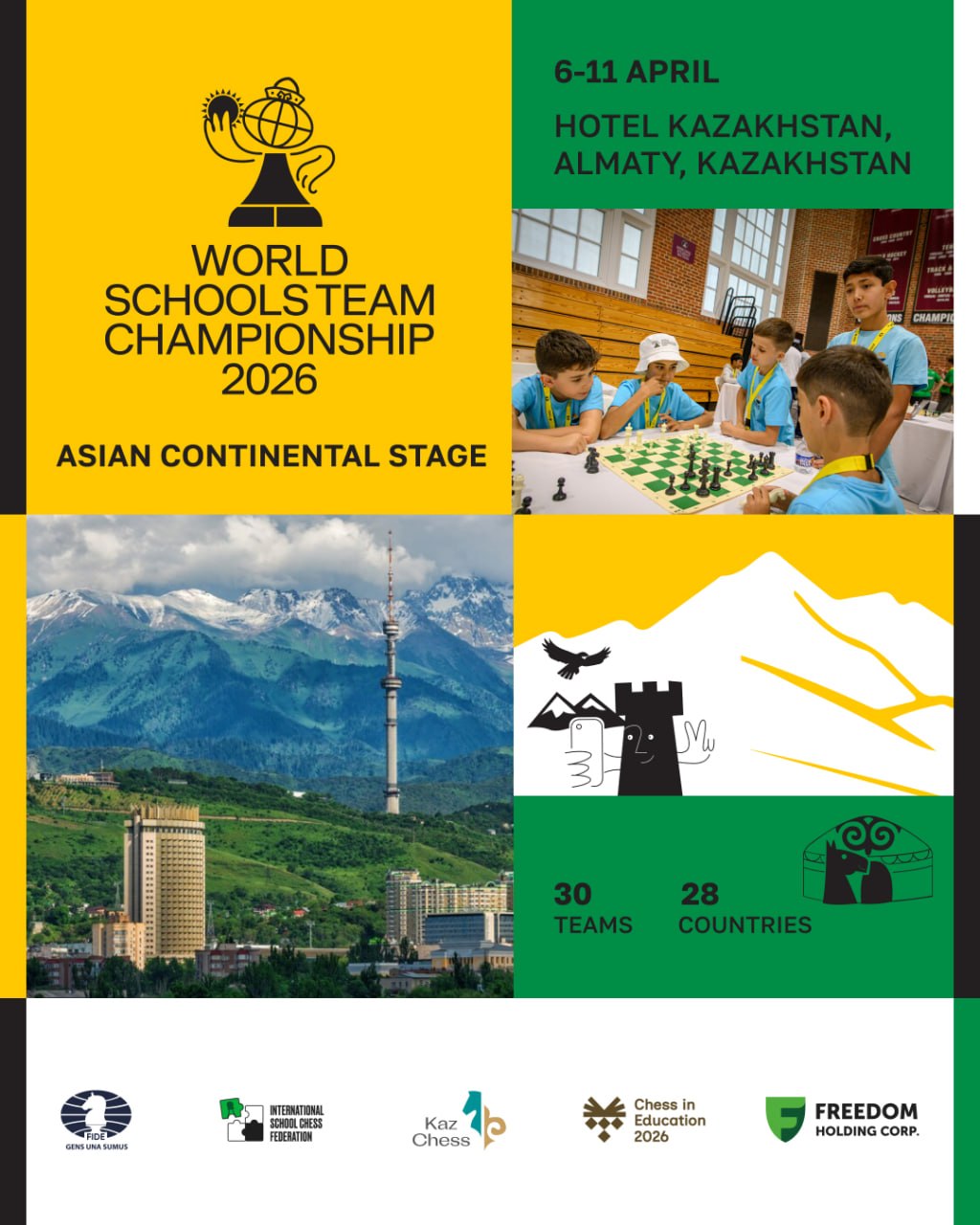 7-10 апреля 2026 г. город Алматы станет главным шахматным центром Азии и даст старт новому глобальному циклу World Schools Team Championship 2026 — первому в истории турниру такого формата, организованному FIDE и Международной федерацией школьных шахмат (ISCF) при поддержке генерального партнёра Freedom Holding Corp.